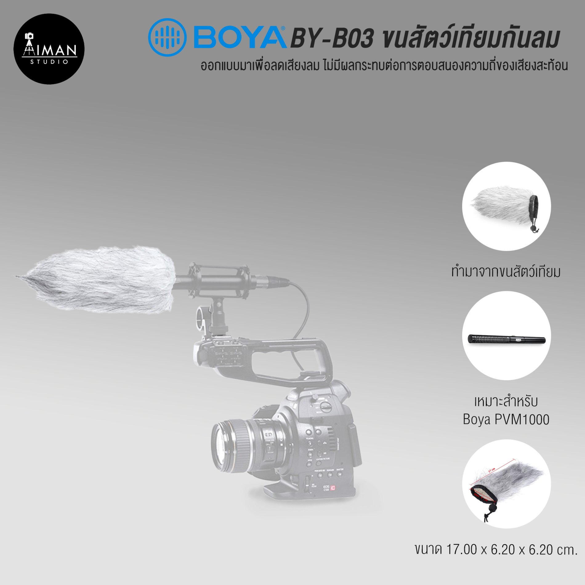 ออกแบบมาเพื่อลดเสียงลม เมื่อมีการบันทึกในสภาพสูงจากพื้น ด้วยการออกแบบที่ไม่มีผลกระทบต่อการตอบสนองความถี่ของเสียงสะท้อน และเสียงรบกวนอื่นๆ เพื่อการบันทึกเสียงที่ได้คุณภาพคมชัดและชัดเจน มาพร้อมกับสายยืดหยุ่นเพื่อปรับตามขนาดของไมโครโฟน