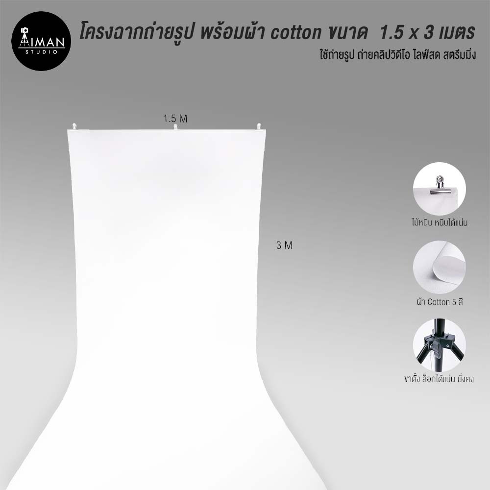 • ขาตั้งปรับสูงได้ 2 เมตร กว้าง 1.5 เมตร. ผ้ายาว 3 เมตร