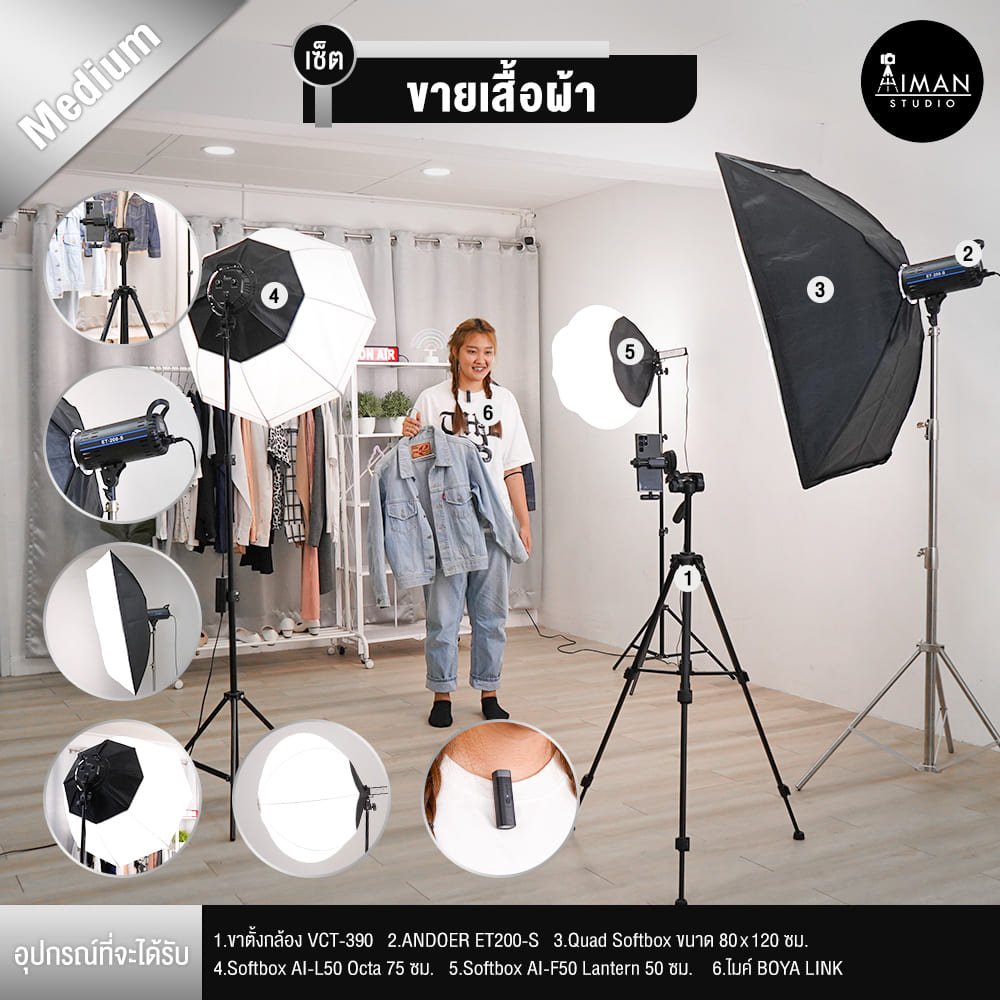 ความสว่างของไฟ Softbox 3 ตัว จะช่วยเพิ่มความโดดเด่นให้เสื้อผ้าและพ่อค้าแม่ค้า